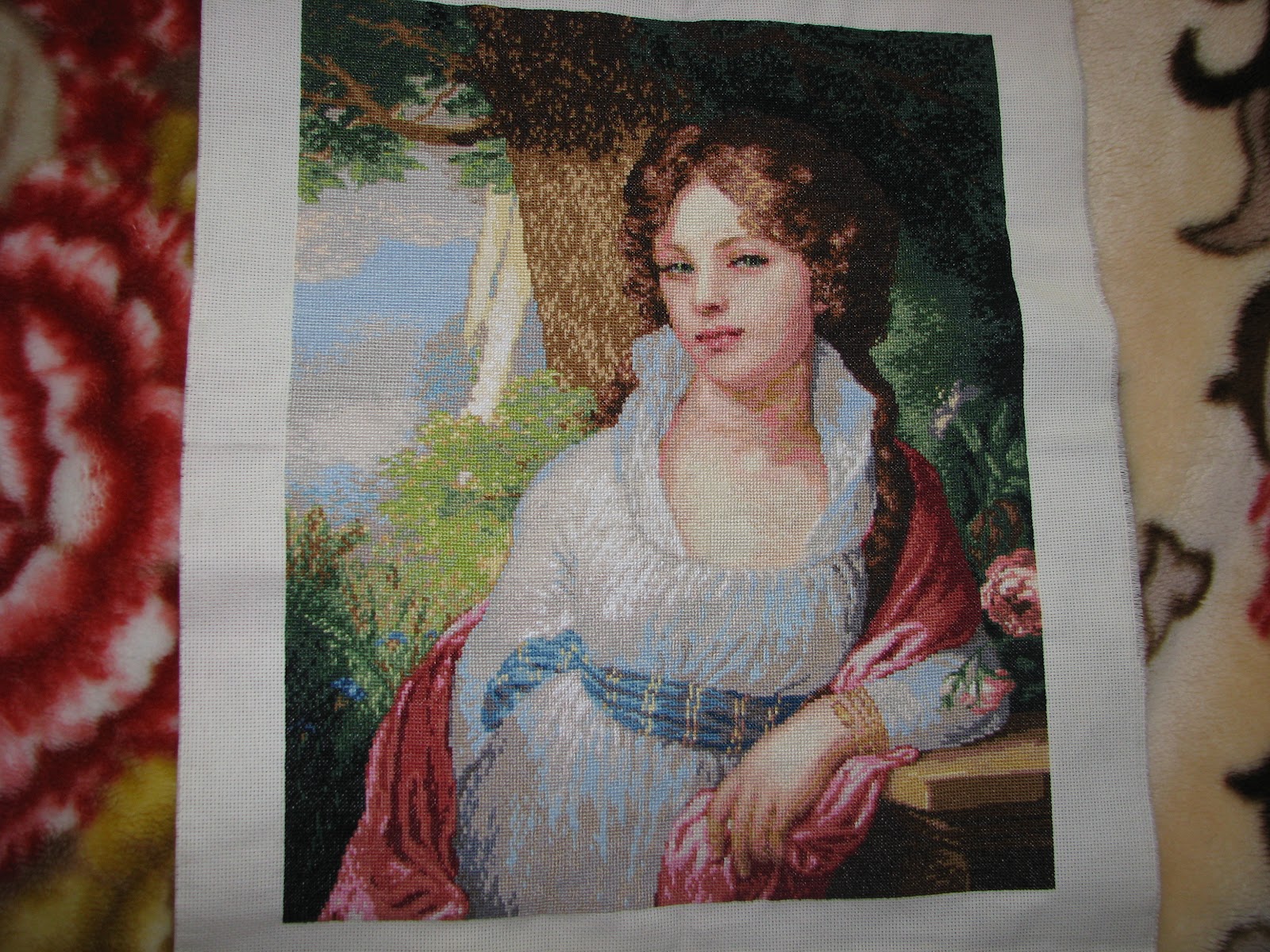 Я не задумываясь купила этот набор для вышивания фирмы "Золотое руно" как только его увидела, потому что с раннего детства в моей комнате висела репродукция картины Боровиковского "Портрет Лопухиной" и я с ним сроднилась.
