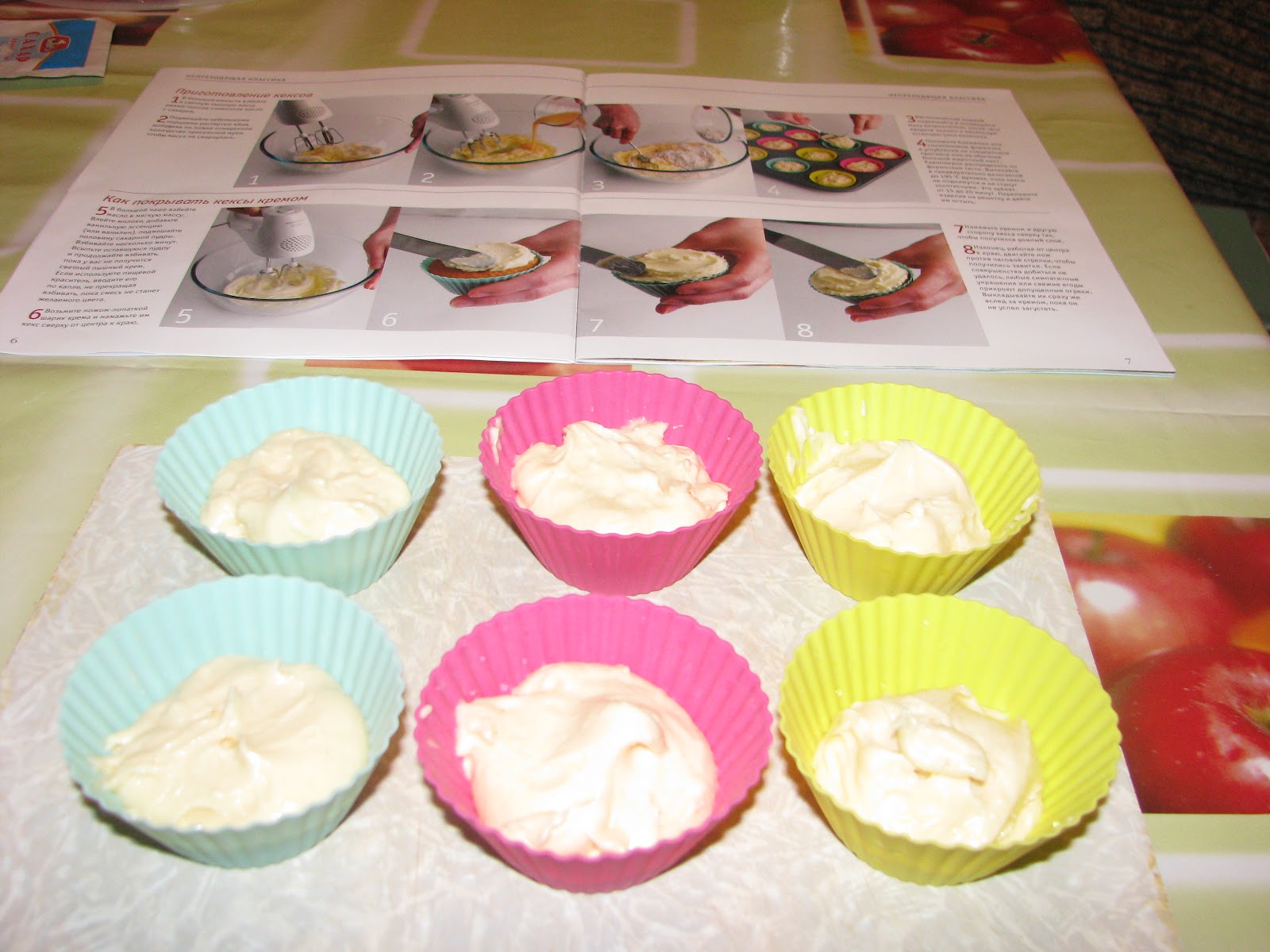Сегодня решили опробовать силиконовые формочки для кексов, которые прилагались к журналу, весёленькие, яркие.  Рецепт простой, точно следовали пошаговой инструкции и всё получилось быстро и вкусно!!!
